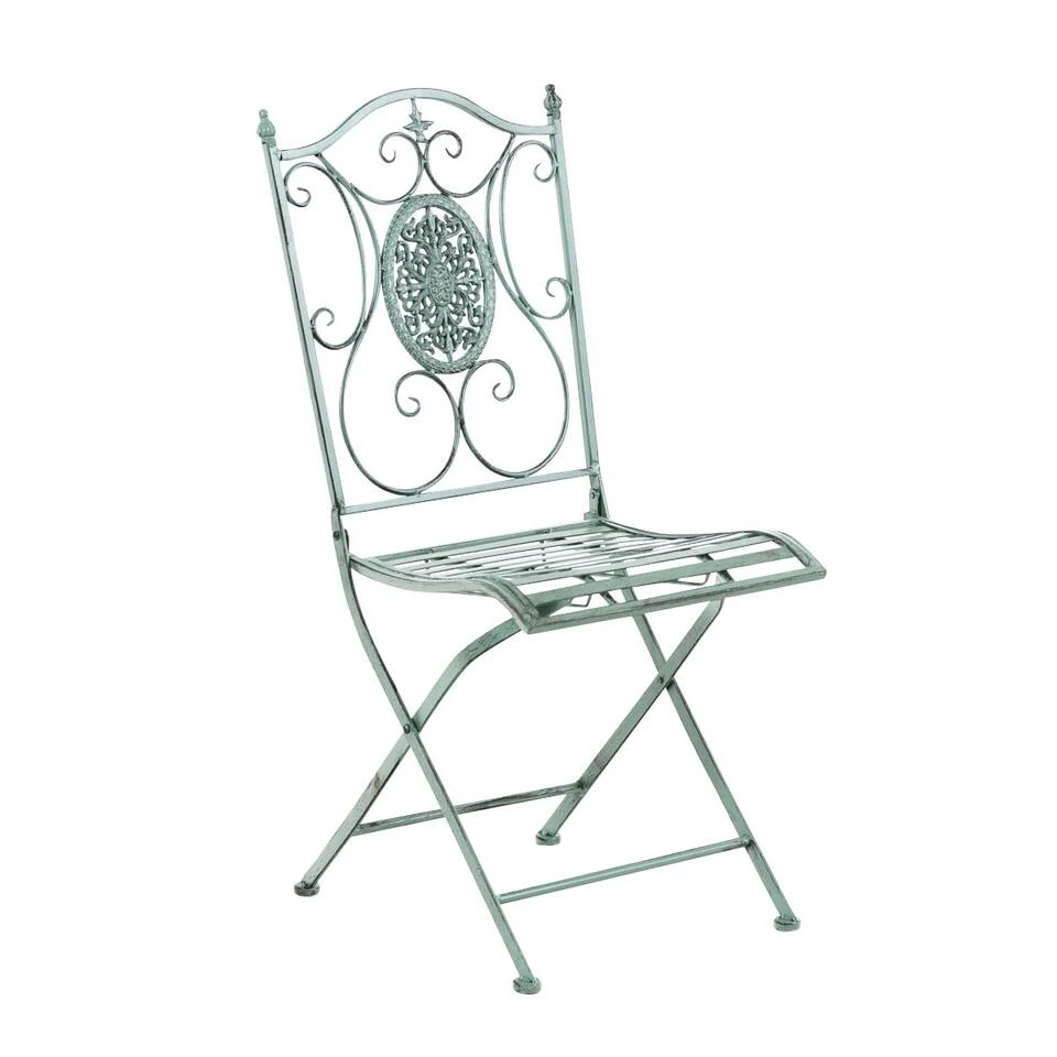 Klapbare ijzeren tuinstoel Sibell, een exclusieve eyecatcher voor elk terras en tuin. De delicate vorm en liefdevol handgemaakte details maken deze stoel uniek en zorgen voor een nostalgische uitstraling.