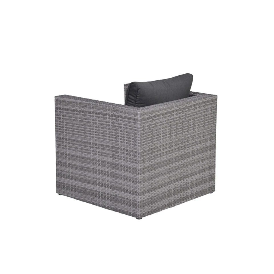 De Lyon loungeset van Garden Impressions is met recht één van de meest populaire sets uit de collectie door de goede prijs-kwaliteit verhouding. Wil je de Lyon loungeset uitbreiden? Kijk dan eens naar deze Lyon lounge stoel, een mooie en comfortabele loungestoel voor buiten. In deze loungestoel zit je heerlijk door de fijne meegeleverde loungekussens. De Lyon lounge stoel combineer je uitstekend bij de Lyon lounge hoekbank, maar kan uiteraard ook prima los aangeschaft worden. Combineer deze stoel bijvoorbeeld met een mooi bijzettafeltje en geniet van een heerlijk bakje koffie in deze fijne stoel. De Lyon lounge stoel is vervaardigd uit een aluminium frame met daaromheen een kwalitatief wicker vlechtwerk draad in de kleur organic grey. Dit wicker is gemaakt van stevig kunststof waardoor de set zeer duurzaam is. De Lyon lounge stoel wordt bovendien geleverd inclusief zit- en rugkussens. De kussens zijn voorzien van een rits waardoor de hoezen gemakkelijk met de hand gewassen kunnen worden. De kussens zijn niet 100% waterdicht, maar zijn wel voorzien van een waterafstotende coating. Dit is vooral erg praktisch als er bijvoorbeeld op het kussen wordt gemorst met drinken. Je veegt het vocht er namelijk gemakkelijk weer af. Na gebruik kunnen de kussens opgeborgen worden in de schuur of een mooie kussenbox. De afmetingen van deze stoel zijn: D 74 x B 74 x H 64 cm. Een uitgebreide collectie loungestoelen vind je binnen de categorie tuinmeubelen. Tuinmeubelen van verschillende mooie merken.