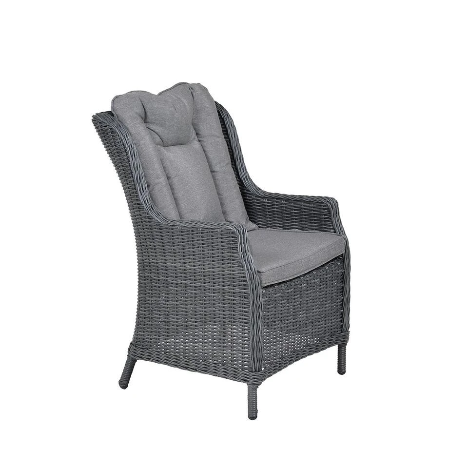 De afmeting van de stoel is: B 62 x D 73 x H 96.5 cm. De set is gemaakt van wicker in de kleur earl grey met een aluminium binnen frame en dikke polyester reflex grey kleurige kussens.
