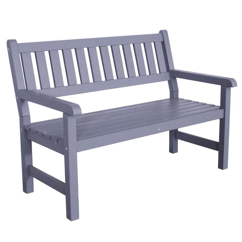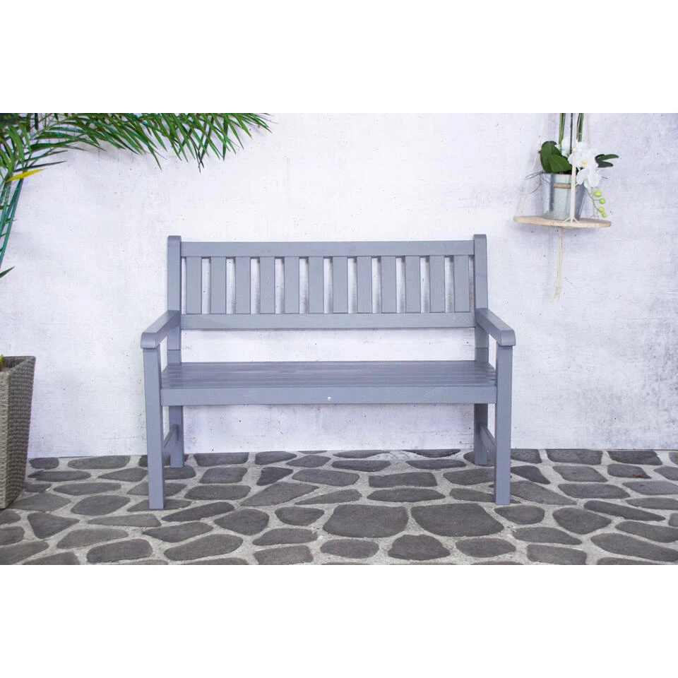 De moderne tuinbank is gemaakt van grenenhout en gebeitst in een grijze kleur. Het 100% FSC gecertificeerde hout heeft een lange levensduur. Dit bankje biedt 2 zitplaatsen voor in je (kleine) tuin, balkon of voortuin.